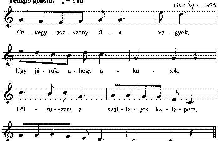 1. Özvegyasszony fia vagyok, Úgy járok, ahogy akarok. Fölteszem a szalagos kalapom, Sirat engem a galambom. 2. Sirat engem a...