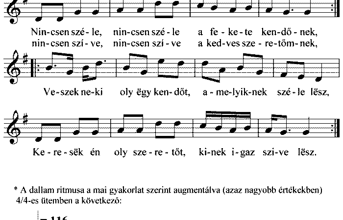 Nincsen széle, nincsen széle A fekete kendőnek, Veszek neki oly ëgy kendőt, amelyiknek széle lësz, Keresëk én oly szeretőt, kinek...