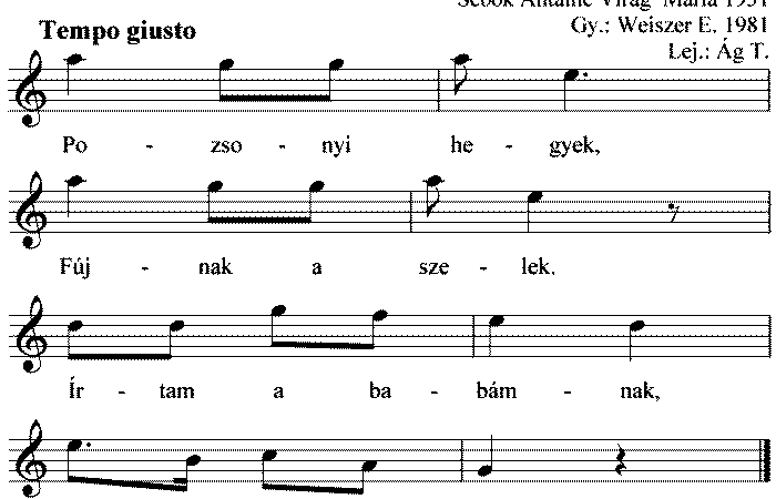 1. Pozsonyi hegyek, Fújnak a hegyek. Írtam a babámnak, Szép szerelmeket. 2. Megírtam neki, El fogom venni. Piros pünkösd napján,...