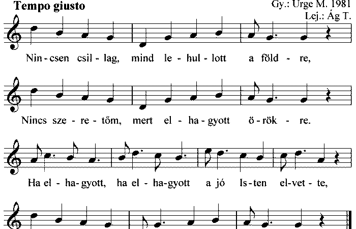 Nincsen csillag, mind lehullott a földre, Nincs szeretőm, mert elhagyott örökre. Ha elhagyott, ha elhagyott, a jó Isten elvette, Annak...