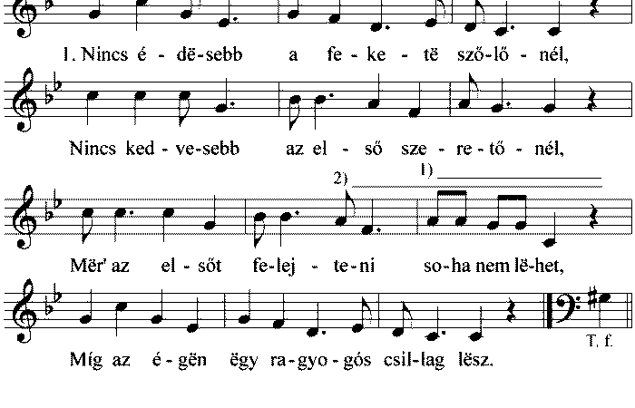 1. Nincs édesebb a fekete szőlőnél, Nincs kedvesebb az első szeretőnél, Mer‘ az elsőt felejteni nem lehet, Míg a fekete...