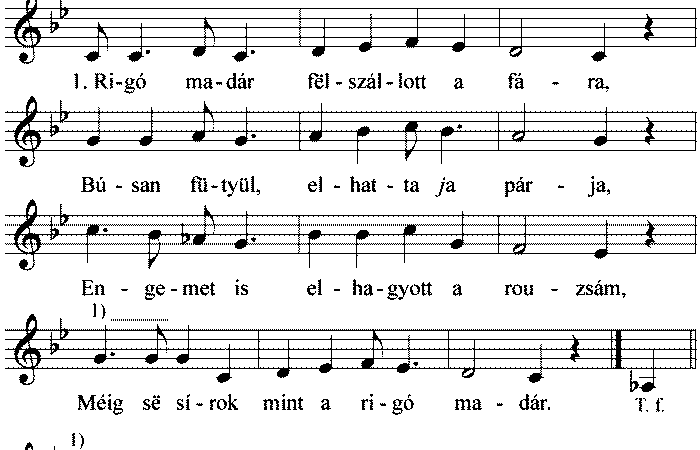 1. Rigómadár fölszállott a fára, Búsul szegény, elhagyta ja párja. Engemet is elhagyott a babám, Mégsem sírok, mint a rigómadár....