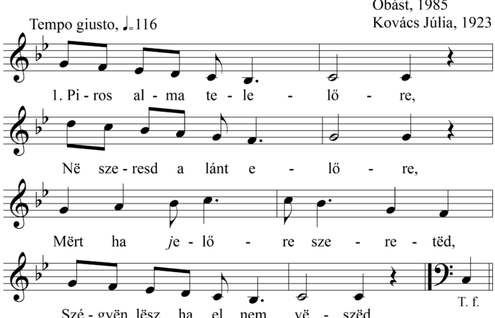 1. Piros alma telelőre, Në szeresd a lánt előre, Mërt ha jelőre szeretëd, Szégyën lësz ha el nem vëszëd. 2....