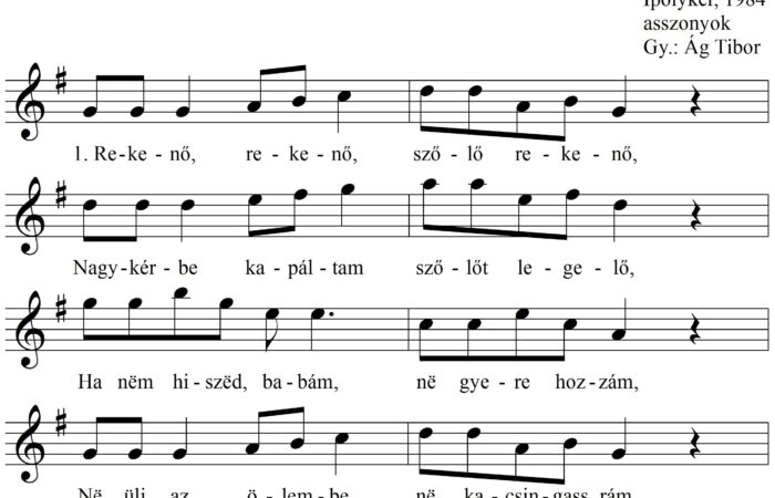 1. Rekenő, rekenő, szőlő rekenő, Nagykérbe kapáltam szőlőt legelő, Ha nëm hiszed, babám, në gyere hozzám, Në ülj az ölembe,...