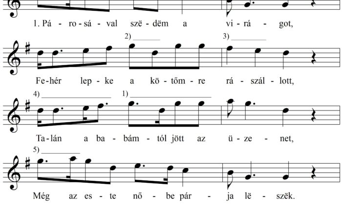 1. Párosával szëdëm a virágot, Fehér lepke a kötőmre rászállott, Talán a babámtól jött az üzenet, Még az este nőbe párja lëszëk. 2....