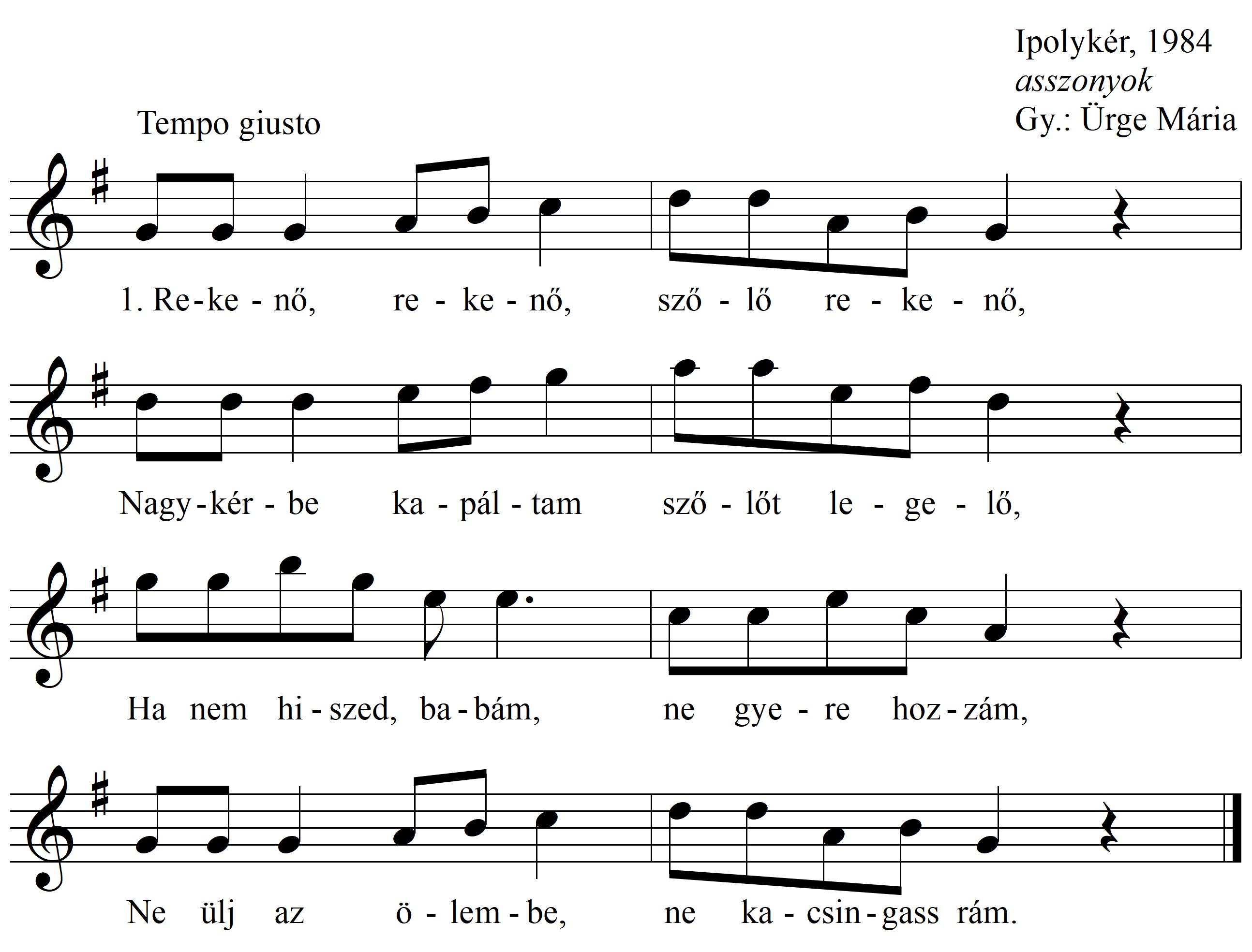 1. Rekenő, rekenő, szőlő rekenő, Nagykérbe kapáltam szőlőt legelő, Ha nem hiszed, babám, ne gyere hozzám, Ne ülj az ölembe,...