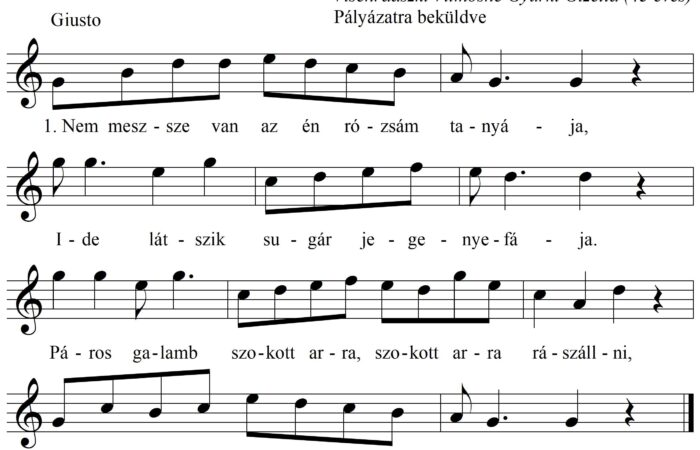 1. Nem messze van az én rózsám tanyája, Ide látszik sugár jegenyefája. Páros galamb szokott arra, szokott arra rászállni, Szép...