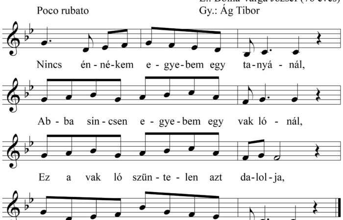 1. Nincs énnékem egyebem egy tanyánál, Abba sincsen egyebem egy vak lónál, Ez a vak ló szüntelen azt dalolja, Gyáva...