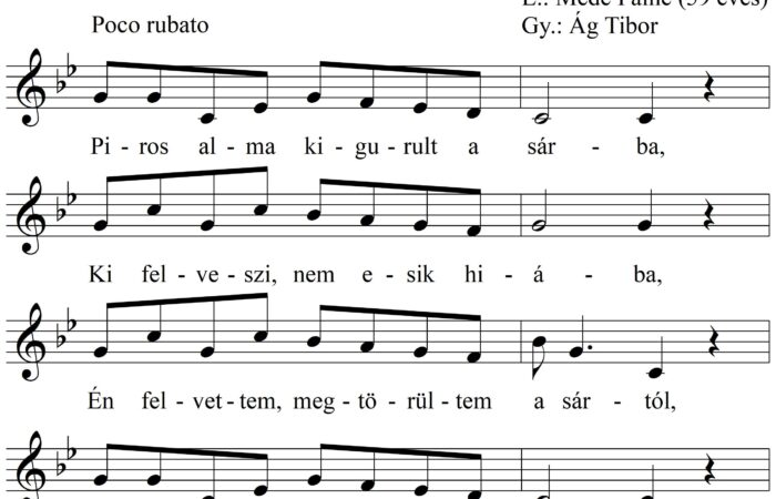 Piros alma kigurult a sárba, Ki felveszi, nem esik hiába, Én felvettem, megtörültem a sártól, Jaj, de messze estem a...