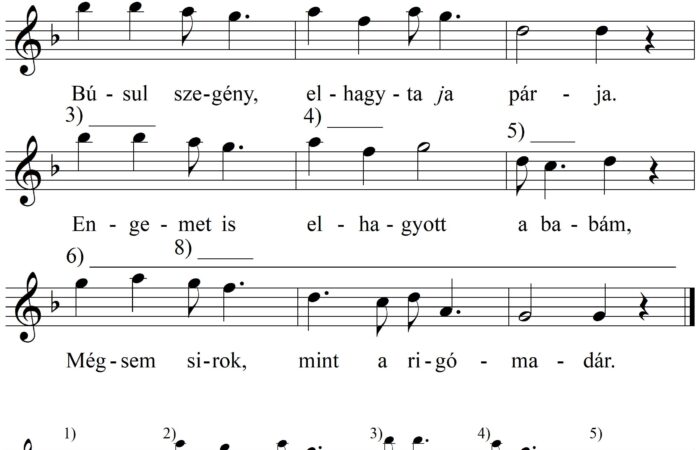 1. Rigó madár fëlszállott a fára, Búsan fütyül, elhatta ja párja, Engemet is elhagyott a rouzsám, Méig së sírok mint...