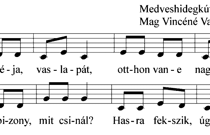 Héja, héja vaslapát, Otthon van-e nagyapád? Otthon bizony mit csinál? Hasra fekszik, úgy dudál.