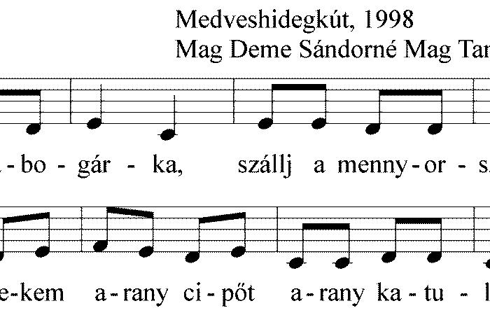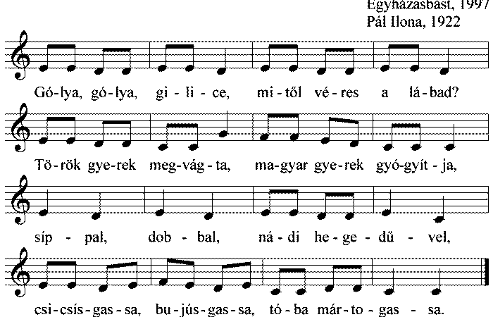 Gólya, gólya, gelice, Mitől véres a lábad? Török gyerek megvágta, Magyar gyerek gyógyítja, Síppal, dobbal, Nádi hegedűvel, Csicsísgassa, bujúsgassa, Tóba...