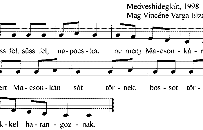 Süss fel, süss fel, napocska, Ne menj Macsonkára. Mert Macsonkán sót törnek, bossot törnek, Tökkel harangoznak.