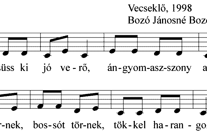 Süss ki, süss ki, jó verő, Ángyomasszony ablaka, Sót törnek, bossót törnek, Tökkel harangoznak.