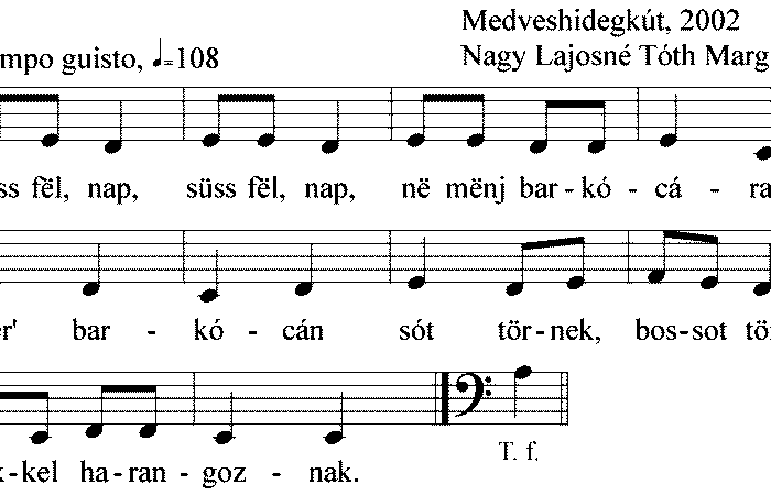 Süss fël nap, Süss fël nap, Në mënj barkócára, Mër’ barkócán sót törnek, Bossot törnek, Tökkel harangoznak.