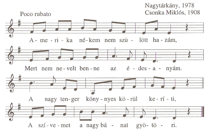 1. Amerika nékem nem szülött hazám,Mert nem nevelt benne az édesanyám.A nagy tenger könnyes körül keríti,A szívemet a nagy bánat...