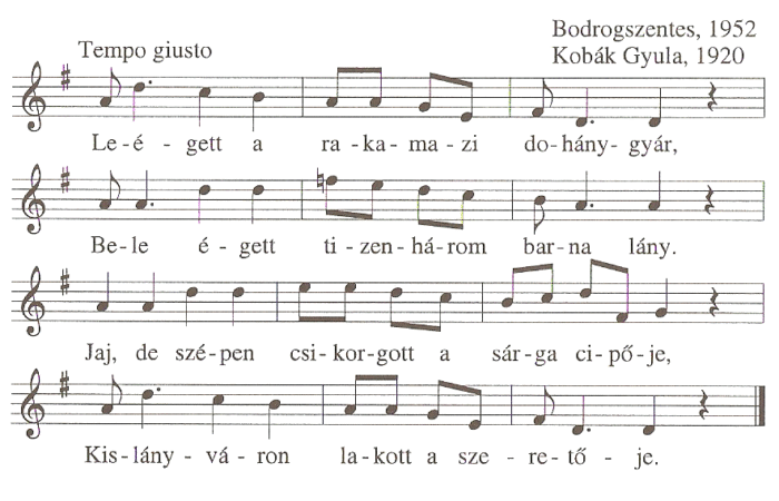 1. Leégett a rakanazi dohánygyár,Bele égett tizenhárom barna lány,Jaj, de szépen csikorgott a sárga cipője,Kislányváron lakott a szeretője.2. Sok ruhája...