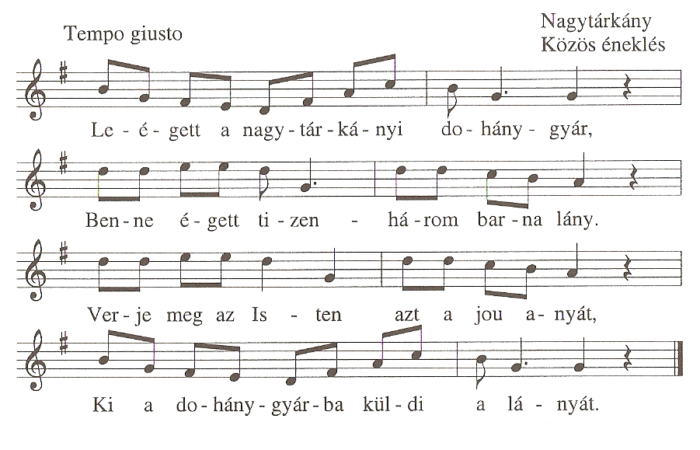 1. Leégett a nagytárkányi dohánygyár,Benne éget tizenhárom barna lány,Verje meg az Isten az jou anyát,Ki a dohánygyárba küldi a lányát.2....