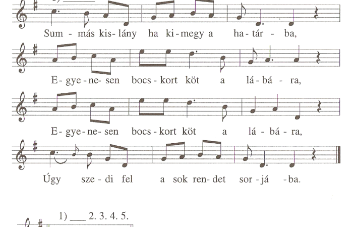1. Summás kislány, ha kimegy a határba,Egyenesen bocskort köt a lábára,Egyenesen bocskort köt a lábára,Úgy szedi fel a sok rendet...