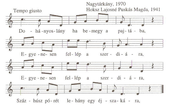 1. Dohányos lány, ha bemegy a pajtába,Egyenesen fellép a szerdiára,Egyenesen fellép a szerdiára,Százhúsz pórét lehány egy éjszakára.2. Dohányos lány nem...