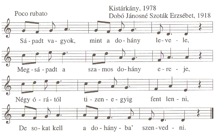 1. Sápadt vagyok, mint a dohány levele,Megsápadt a szamos dohány ereje,Négy órától tizenegyig fent lenni,De sokat kell a dohányba szenvedni.2....