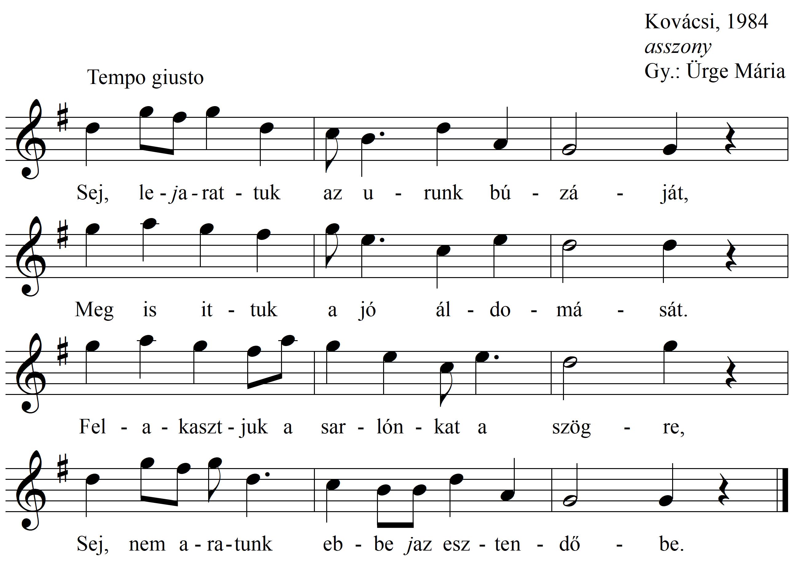 Sej, lejarattuk az urunk búzáját, Meg is ittuk a jó áldomását, Felakasztjuk a sarlónkat a szögre, Sej, nem aratunk ebbe...