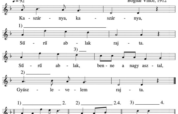 Kaszárnya, kaszárnya, Sűrű ablak rajta. Sűrű ablak, benne a nagy asztal, Gyászlevelem rajta. Gyászlevelem rajta, Nincs, aki elolvassa. Maj’ lesz...