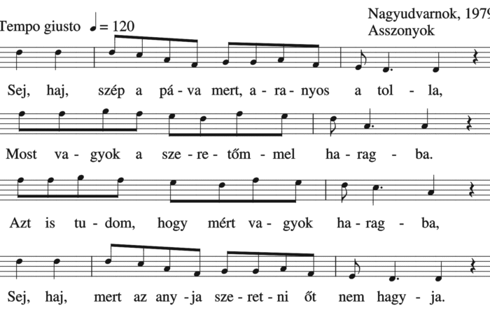 Sej, haj, szép a páva, mert aranyos a tolla, Most vagyok a szeretőmmel haragba. Azt is tudom, hogy mért vagyok...