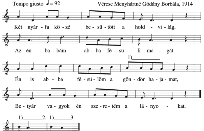 Két nyárfa közé besütött a holdvilág, Az én babám abba fésüli magát. Én is abba fésülöm a göndör hajamat, Betyár...