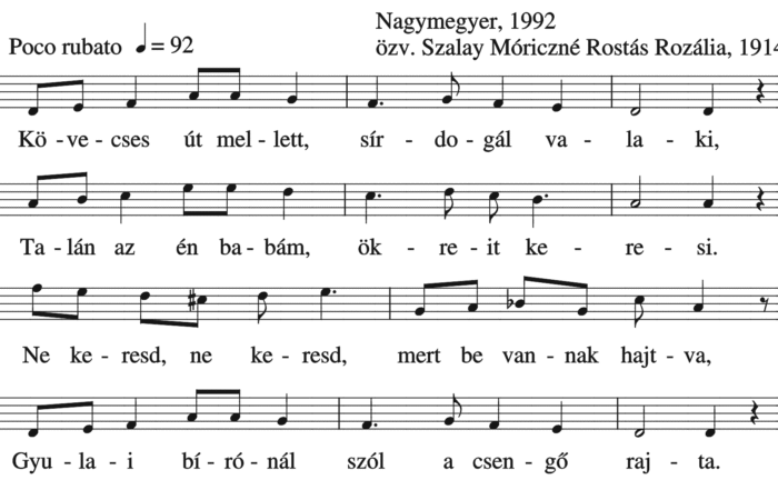 Kövecses út mellett sírdogál valaki, Talán az én babám, ökreit keresi. Ne keresd, ne keresd, mert be vannak hajtva, Gyulai...