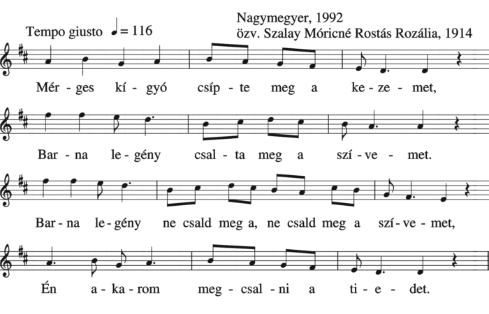 Mérges kígyó csípte meg a kezemet, Barna legény csalta meg a szívemet. Barna legény ne csald meg a, nem csald...