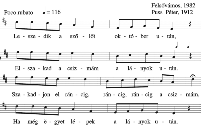 Leszedik a szőlőt október után, Elszakad a csizmám a lányok után. Szakadjon el ráncig, ráncig, ráncig a csizmám, Ha még...