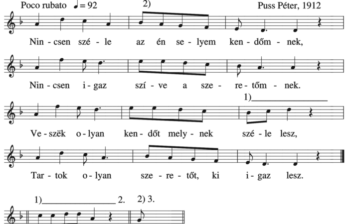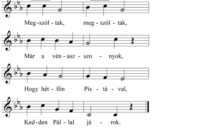 1. Megszóltak, megszóltak, Már a vénasszonyok, Hogy hétfőn Pistával, Kedden Pállal járok. 2. Szeredán Ambrussal, Csütörtök Jánossal, Pénteken, szombaton, Zsandárral,...