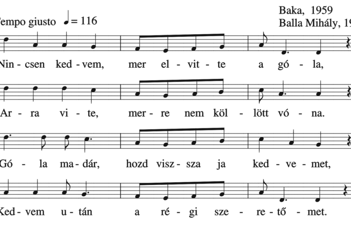 Nincsen kedvem, mert elvitte a góla, Arra vitte, merre nem kölött vóna, Gólamadár hozd visza ja kedvemet, Kedvem utám a...