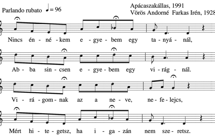 Nincs énnékem egyebem egy tanyánál, Abba sincsen egyebem egy virágnál. Virágomnak az a nevem nefelejcs. Mért hitegetsz, ha igazán nem...
