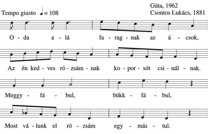 Oda alá faragnak az ácsok, Az én kedves rózsámnak koporsót csinálnak. Meggyfábul, bükkfábul, Most válunk el rózsám egymástul.