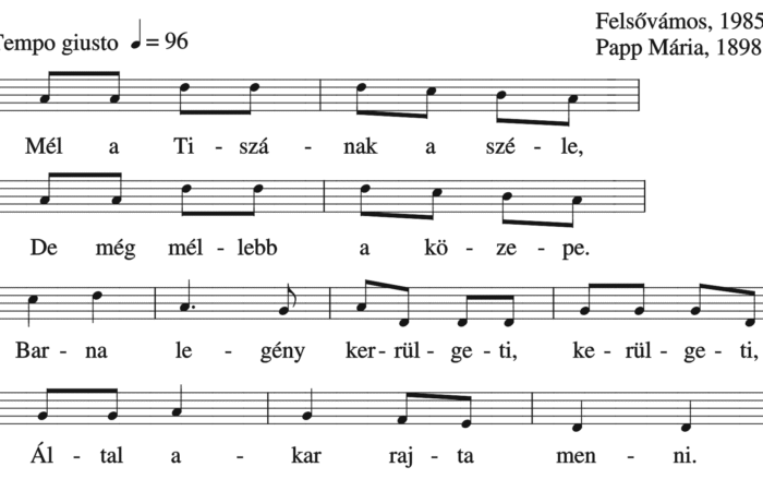 Mél a Tiszának a széle, De még mélebb a közepe. Barna legény kerülgeti, kerülgeti, Által akar rajta menni. Által akar...