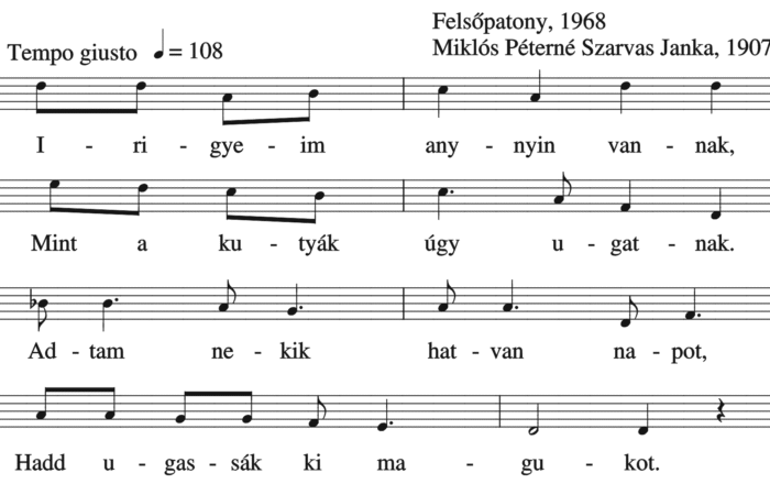 Irigyeim annyin vannak, Mint a kutyák, úgy ugatnak. Adtam nekik hatvan napot, Hadd ugassák ki magukot. Kék a kötőm kerületi,...