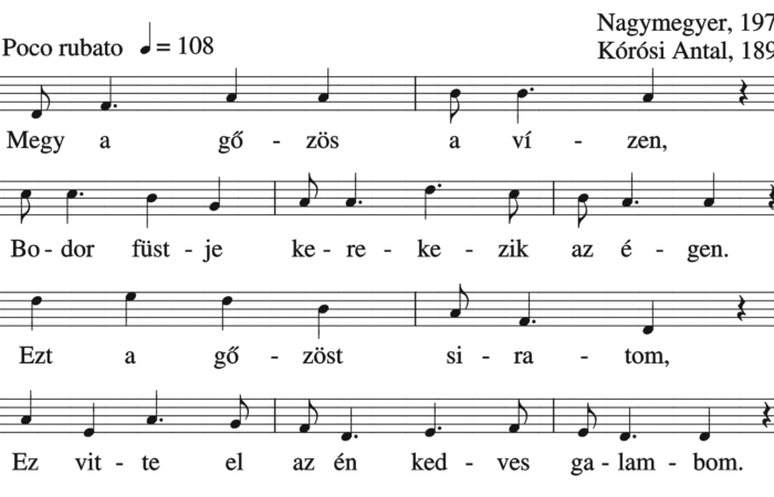 Megy a gőzös a vízen, Bodor füstje kerekezik az égen. Ezt a gőzöst siratom, Ez vitte el az én kedves...
