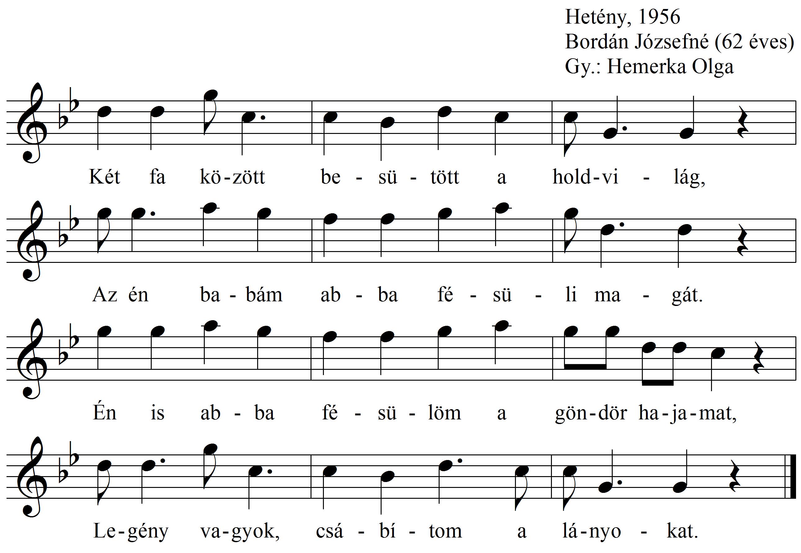 Két fa között besütött a holdvilág, Az én babám abba fésüli magát. Én is abba fésülöm a göndör hajamat, Legény vagyok, csábítom...