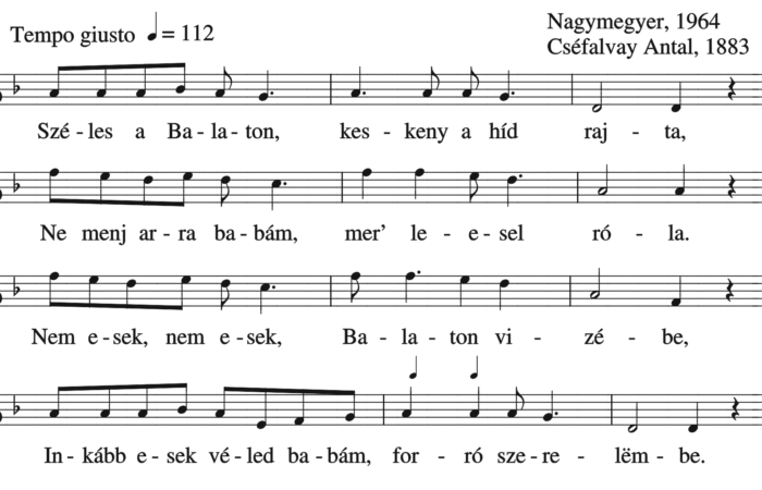 Széles a Balaton, keskeny a híd rajta, Ne menj arra babám, mer’ leesel róla. Nem esek, nem esek, Balaton vizébe,...