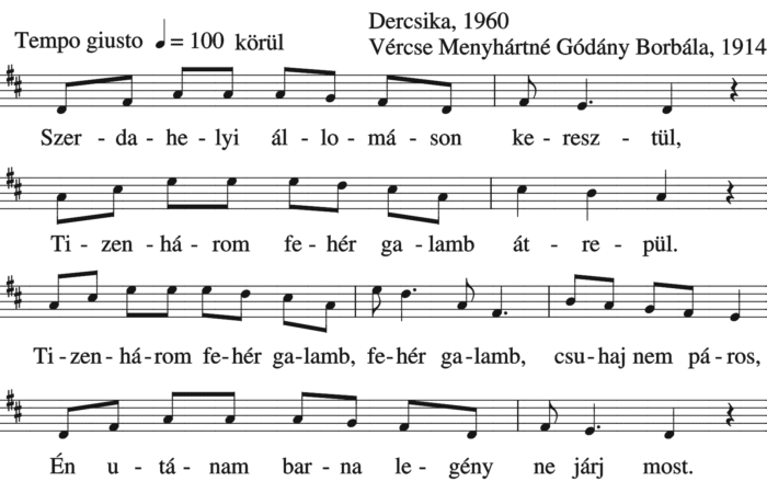 Szerdahelyi állomáson keresztül, Tizenhárom fehér galamb átrepül. Tizenhárom fehér galamb, fehér galamb, csuhaj nem páros, Én utánam barna legény ne...