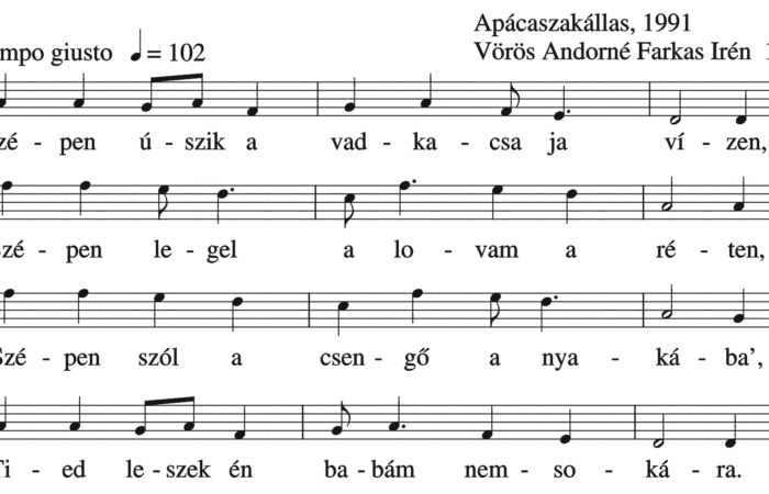 Szépen úszik a vadkacsa ja vízen, Szépen legel a lovam a réten, Szépen szól a csengő a nyakába’, Tied leszek...