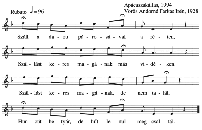 Száll a daru párosával a réten, Szállást keres magának más vidéken. Szállást keres magnak, de nem talál, Huncut betyár, de...