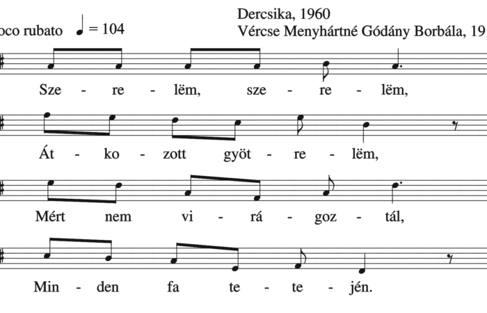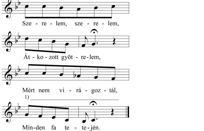 Szerelëm, szerelëm, Átkozott gyötrelëm, Mért nem virágoztál, Minden fa tetején. Minden fa tetején, Minden ág levelén, Hogy szakított volna, Minden...