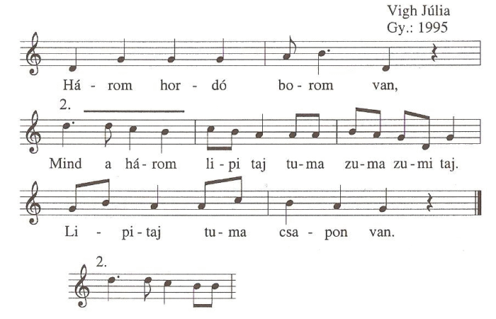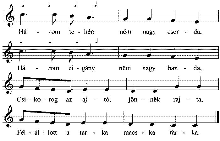 1. Három tehén nëm nagy csorda, Három cigány nëm nagy banda, Csikorog az ajtó, jönnëk rajta, Fëlállott a tarka macska...