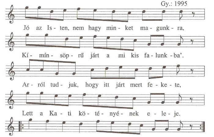 Jó az Isten, nem hagy minket magunkra,Kímínsöprű járt a mi falunkba.Arról tudjuk, hogy itt járt mert fekete,Lett a Kati kötényének...