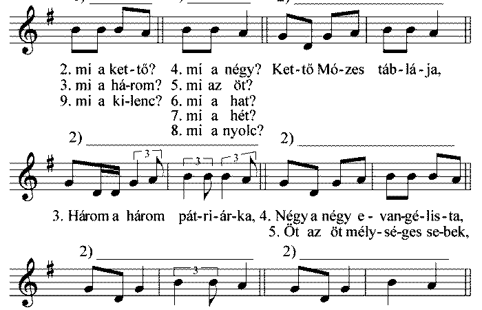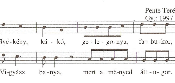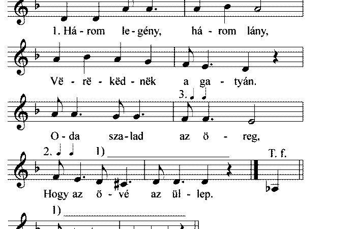1. Három legény, három leány, Verekednek a gatyán, Oda szalad az öreg, Hogy övé az üllep. 2. Az üllëpëm hagyjátok,...