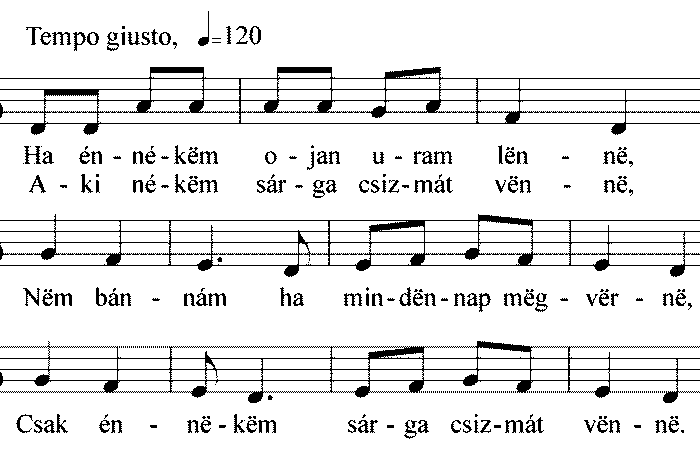 1. Ha én nékem ojan uram lenne, Aki nékem sárga csizmát venne, Nem bánnám ha mindennap megverne, Csak én nekem...