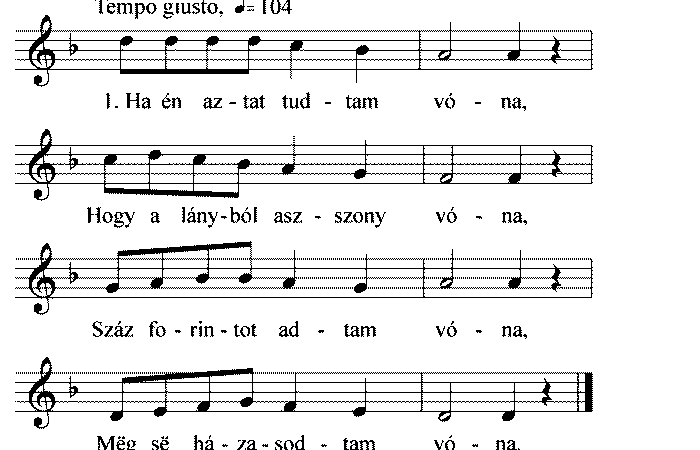 1. Ha én az tudtam vóna, Hogy lányból asszony vóna, Száz forintot adtam vóna, Meg se házasodtam vóna. 2. Jaj,...